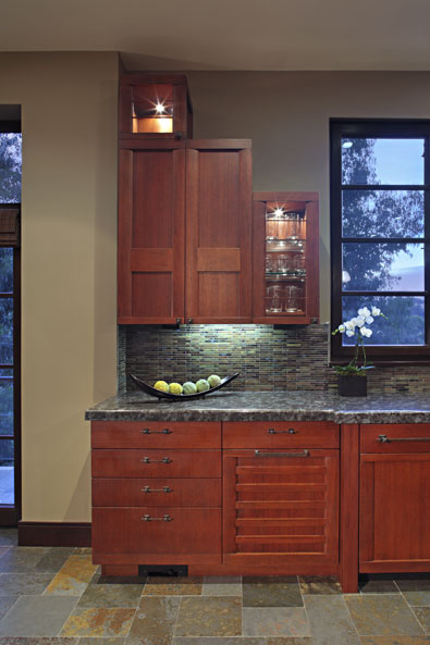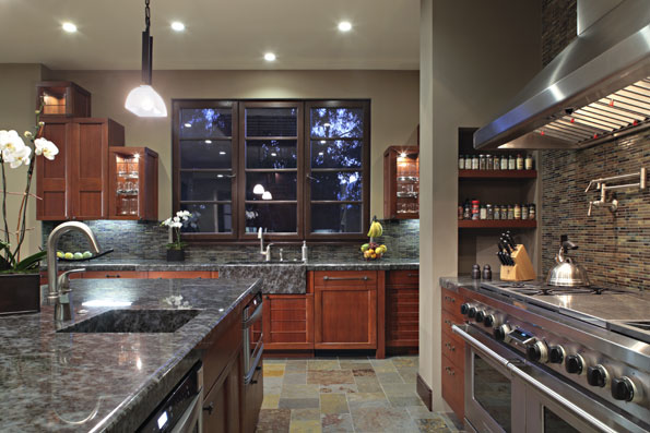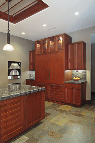 To achieve this, varied cabinet heights and door panel styles echo Eastern architectural forms, with broad mullions reminiscent of the obi sashes on kimono. The countertops are in Labradorite, a deep, mysterious stone with flecks of color much like the darting carp in the owner’s koi pond.