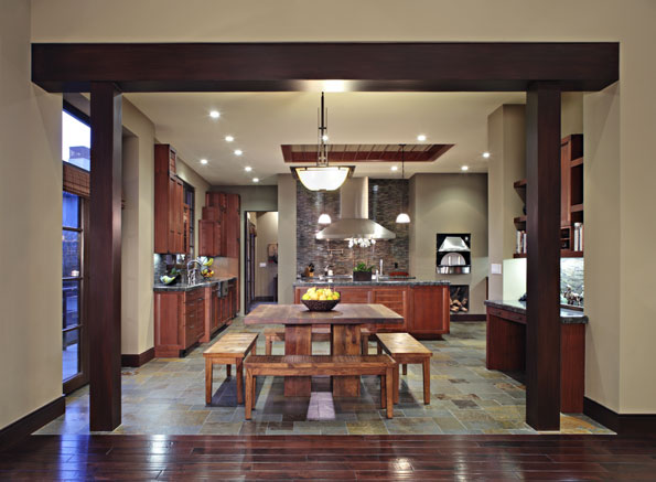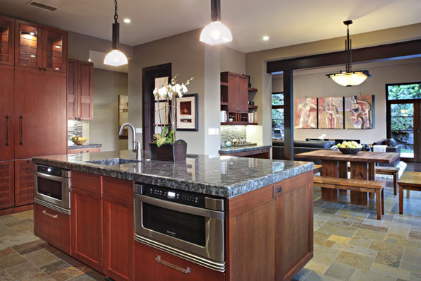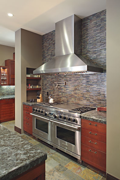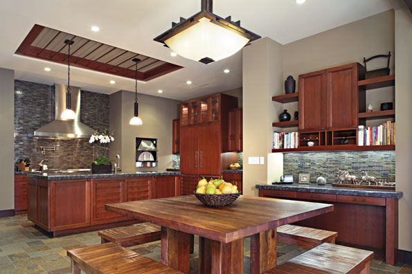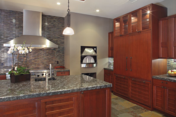 | For this entertainer’s kitchen, the owner wanted a strong Asian aesthetic merged with a warm Tuscan sensibility.